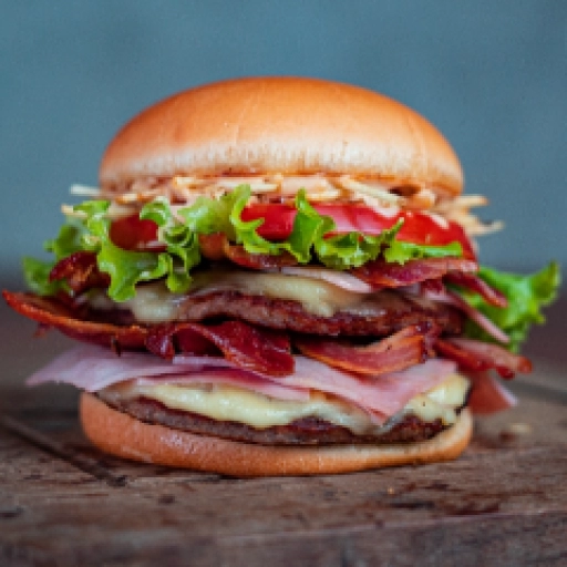 3 pães, 3 carnes, 3 queijos, ovo, presunto, bacon, calabresa, salada, batata palha e molho especial